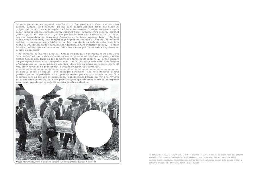 todas as vezes que sou parado, tomado como bandido,delinquente,mau elemento, narcotraficante, ladrão, terrorista, débil mental, louco, psicopata, sociopata, entre outras possíveis ameaças sociais pela polícia militar y oficiais similares em diferentes partes deste mundo.